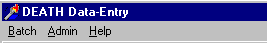 The DEATH Data-Entry application has three main-menu options. Clicking on one of them will cause a drop-down menu to appear that contains menu items related to the main-menu option that was chosen. Batch: Create, open, verify and print batch data. Setup the printer. Exit the application. Admin: Issue Ad-Hoc queries and view/print the results. Print hardcopy for any batch. Upload batch data to mainframe. Help: Access the on-line help system. View the 'About' dialogbox. |
